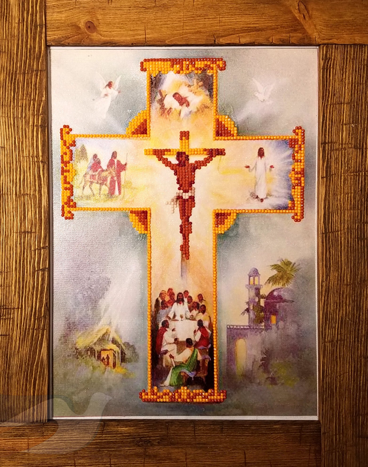 Diamond Dots w/handmade, reclaimed wood frame portrait, depicting the life of Jesus—Birth, Flight into Egypt, Last Supper, Crucifixion, and Resurrection. Perfect to hang in your home or to give as a gift.