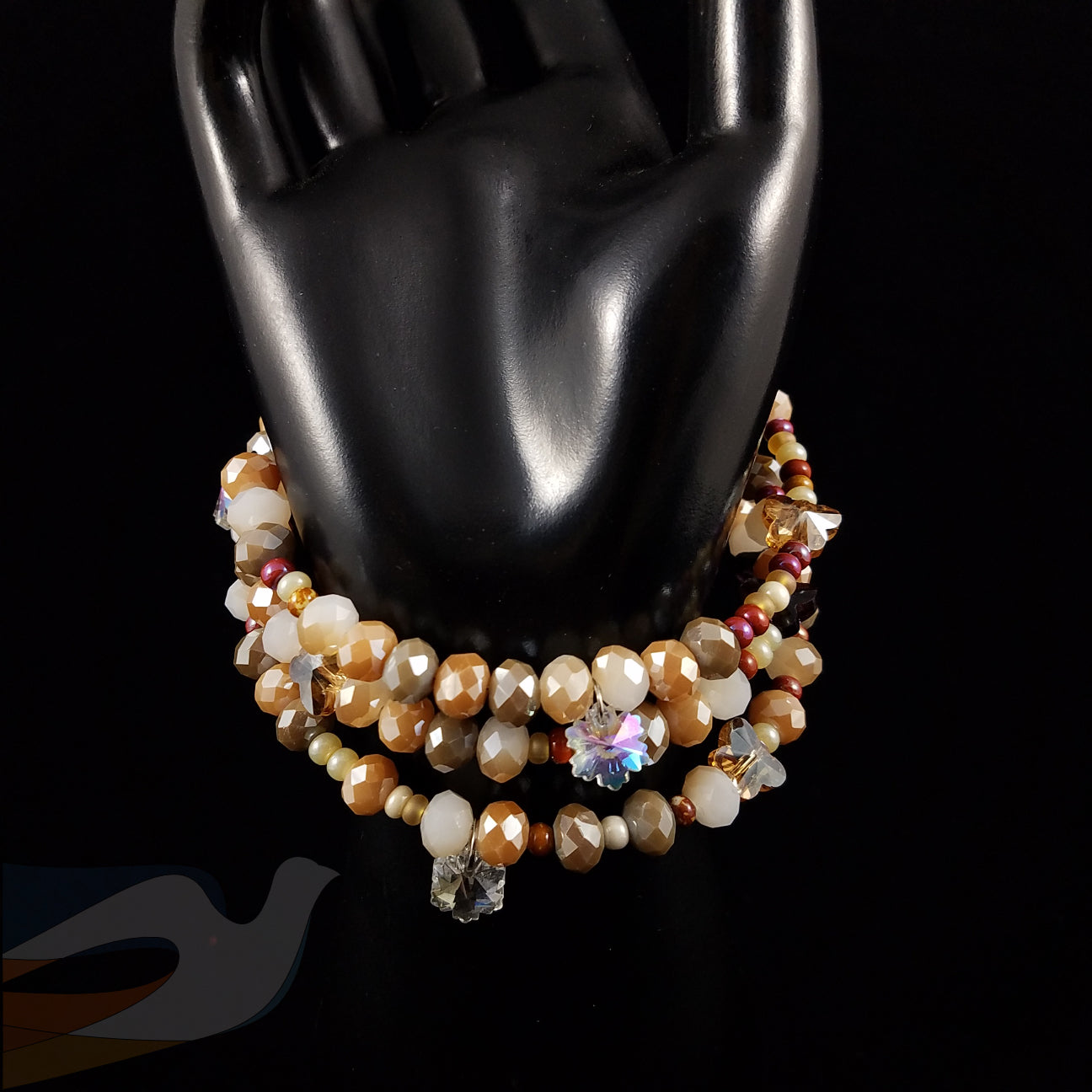 Multi wrap Memory wire bracelet made with multi colored brown beads with reddish colored small seed beads, several crystal butterfly beads and crystal charms.