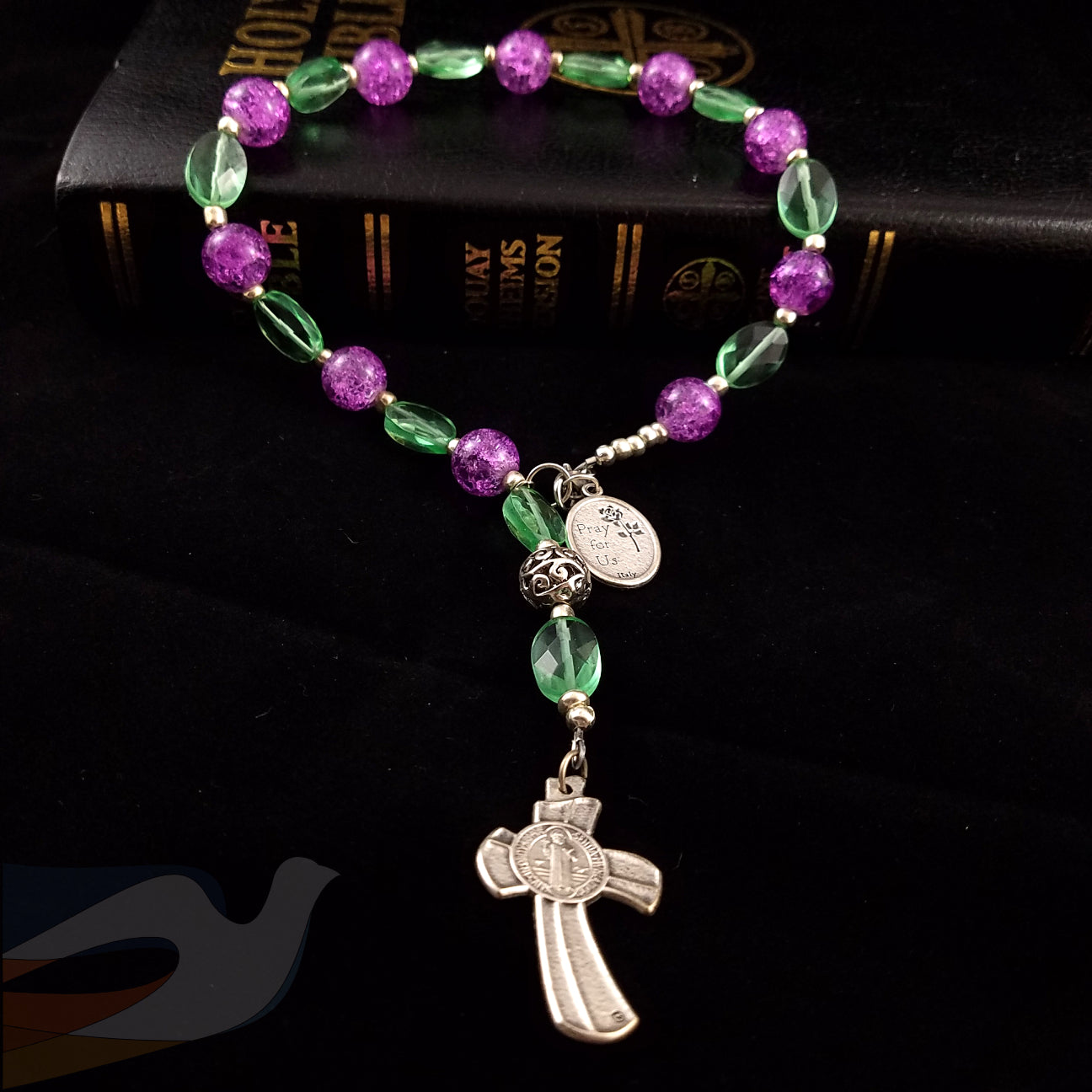 Made with purple and green glass beads, Silver colored scrolled, filigreed metal bead, Contemporary St. Benedict crucifix and silver colored metal. This is a single decade rosary, designed for your vehicle With a lobster clasp to make for ease of mounting on your vehicle mirror, without the crucifix banging against the dashboard or having to wrap a rosary several times around the mirror.